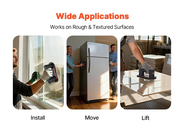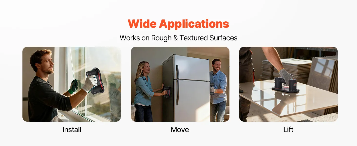 Dieser Vakuumheber eignet sich zum Verlegen großer Fliesen, zur Handhabung von Glas, zum Einbau von Türen und Fenstern sowie für Umzugsarbeiten. Er unterstützt problemlos Renovierungsarbeiten im Eigenheim und Industrieprojekte.