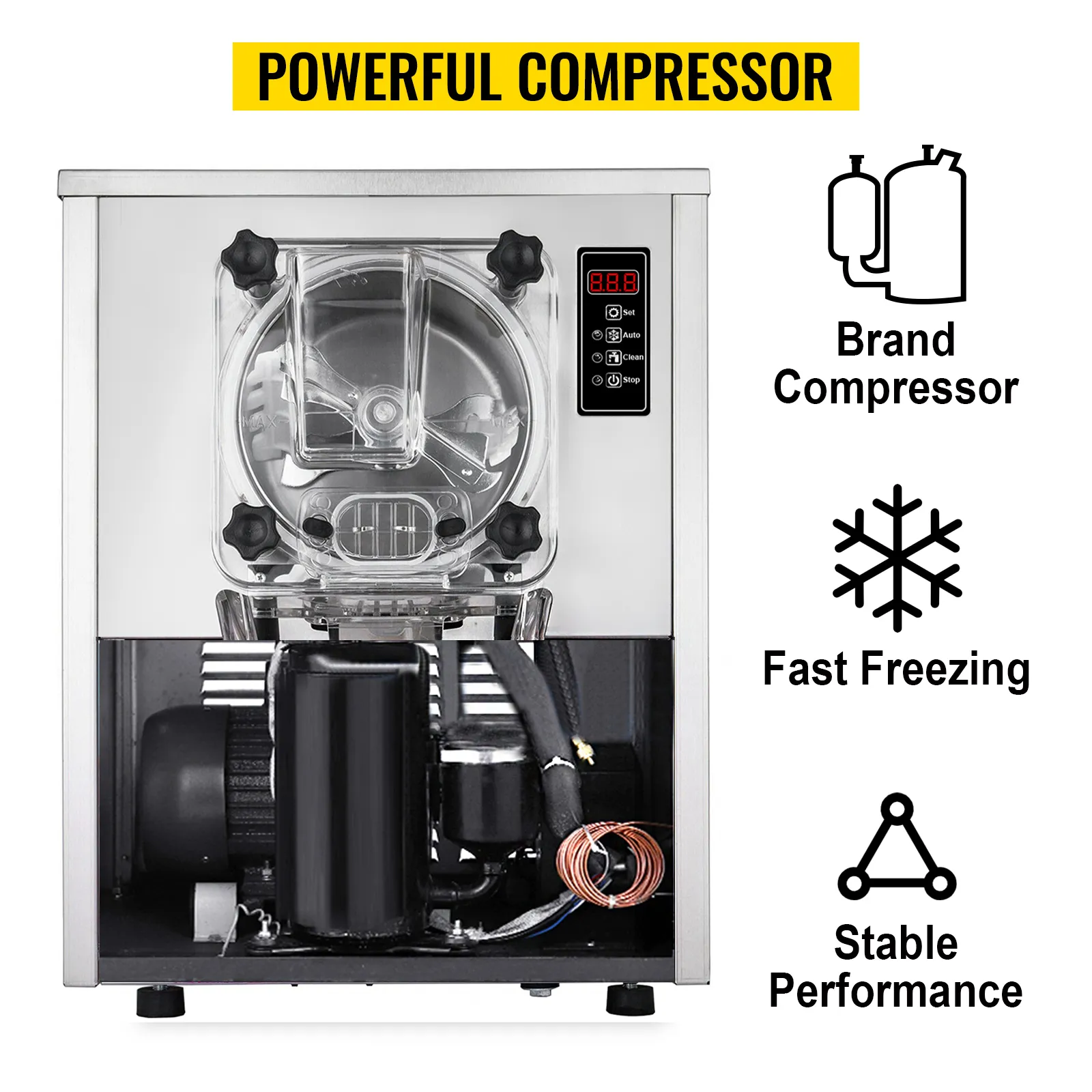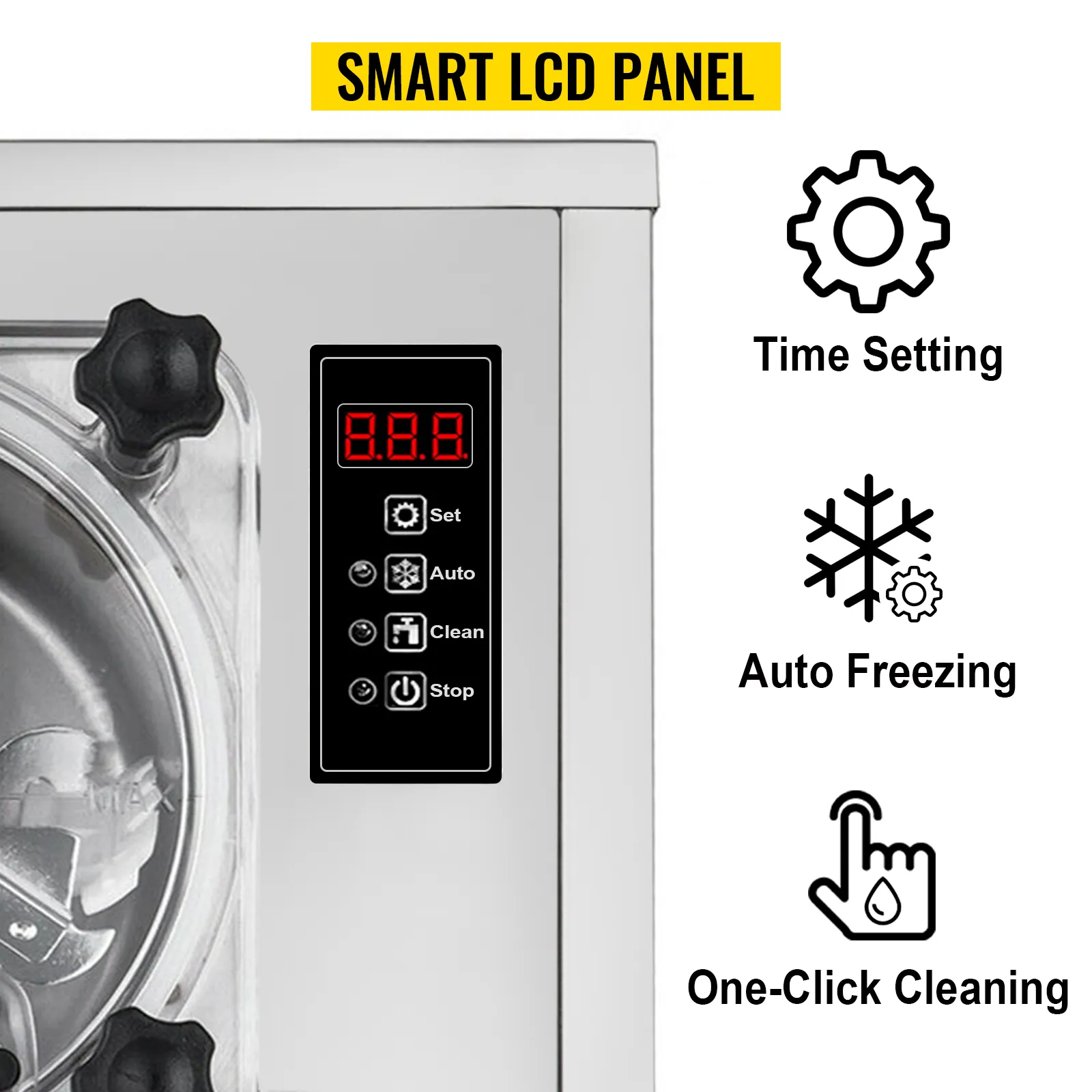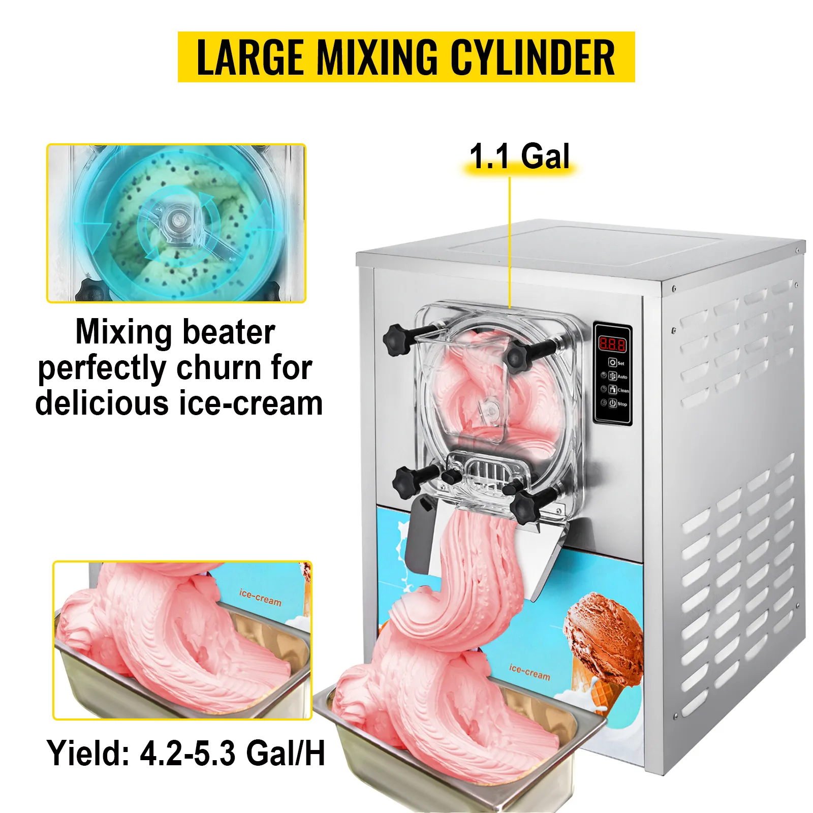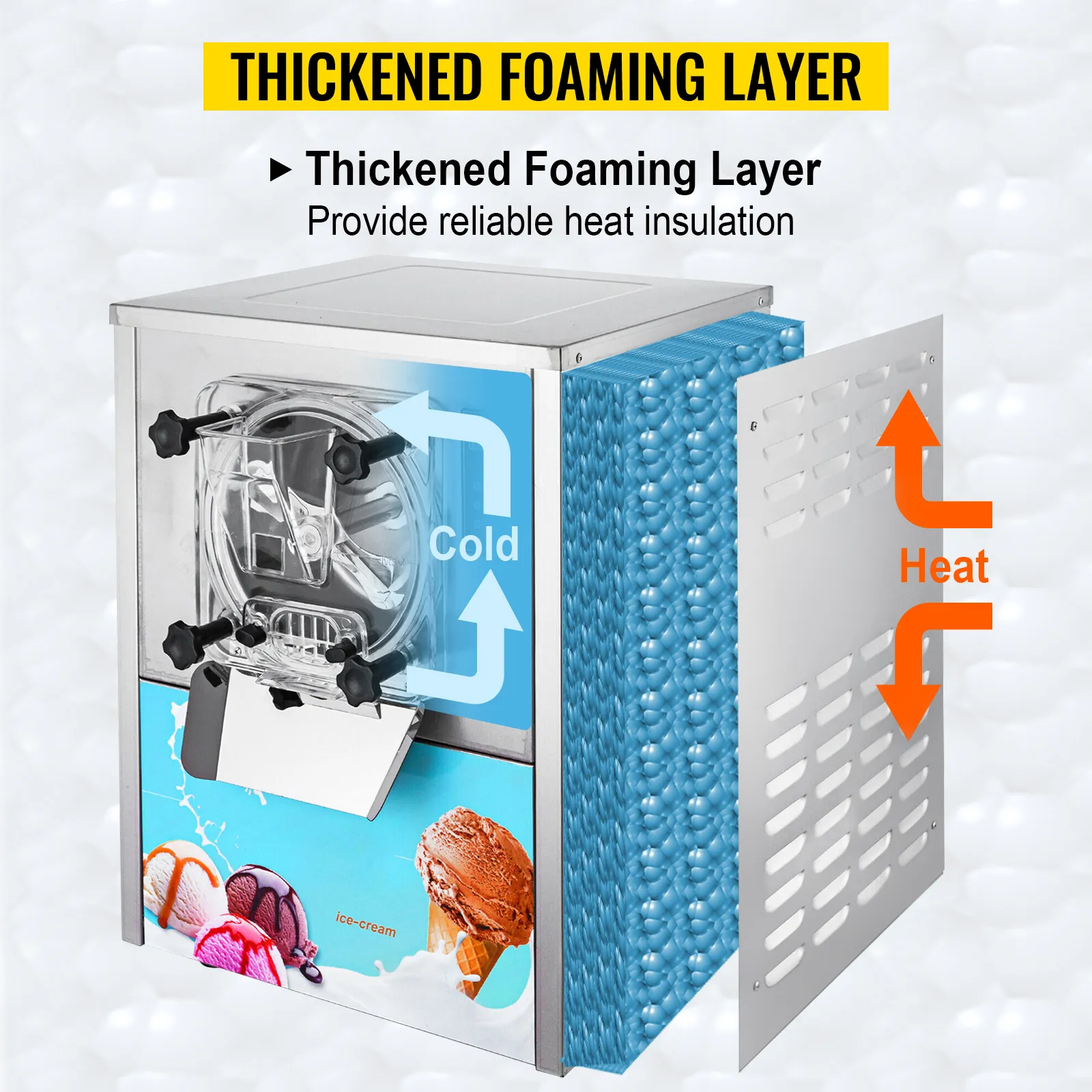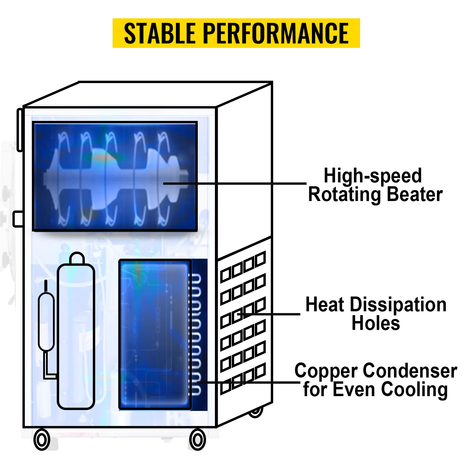 Dank des eingebauten 4,2 L-Kühlzylinders und des schnell rotierenden Dreifach-Schlägers bietet unsere kommerzielle Harteis-Maschine eine effiziente Eisherstellung, und der Ausstoß pro Stunde erreicht etwa 16-20 L. Perfektes Schütteln für glatte, cremige Ergebnisse.