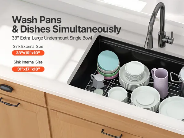 Müheloses Platzieren von Pfannen & Geschirr: Die 33 x 19 x 10 Zoll (838 x 482 x 254 mm) große Einzelspüle im Landhausstil bietet Platz für große Töpfe, Backbleche und Geschirr. Das 10 mm dicke Becken und die 15 mm verstärkten Kanten reduzieren Spritzer. Die Unterbauspüle ist ideal für kompakte Küchen und platzsparend.