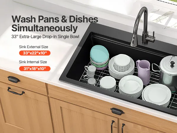 Müheloses Platzieren von Pfannen und Geschirr: Die 33 x 22 x 10 Zoll (840 x 560 x 250 mm) große Einzelspüle im Landhausstil bietet Platz für große Töpfe, Backbleche und Geschirr. Das 10 mm dicke Becken und die 15 mm verstärkten Kanten sorgen für Stabilität und reduzieren Spritzer. Die Barspüle ist ideal für kompakte Küchen und platzsparend