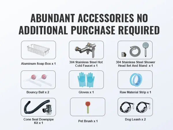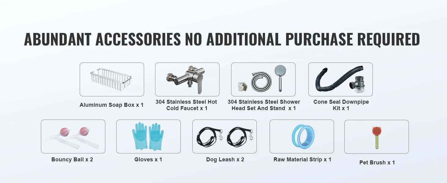 Das Grunddesign dieser 50-Zoll-Badestation für Hunde ist ein praktisches All-in-One-Design. Es enthält eine Seifenbox und umfangreiches Zubehör, um Ihr Pflegeerlebnis zu vervollständigen. Die eingebaute Seifenbox hält die Pflegeutensilien in Reichweite. Dies macht den Badevorgang effizienter. Sie erhalten alles, was Sie für eine effektive Wäsche benötigen. Das All-Inclusive-Zubehör stellt sicher, dass Sie alles haben, was Sie für eine gründliche Wäsche benötigen, was Zeit und Mühe spart. Es sind keine zusätzlichen Pfleger erforderlich. Dank dieser Bequemlichkeit ist die Aufrechterhaltung der Haustierhygiene einfacher. Das durchdachte Design sorgt dafür, dass eine erfolgreiche Pflegesitzung reibungslos und effektiv verläuft.