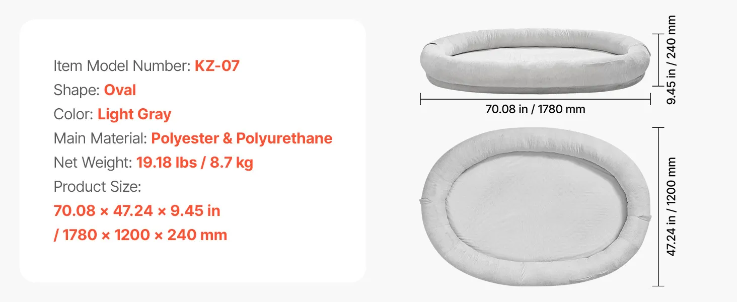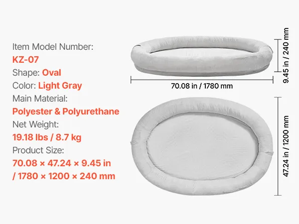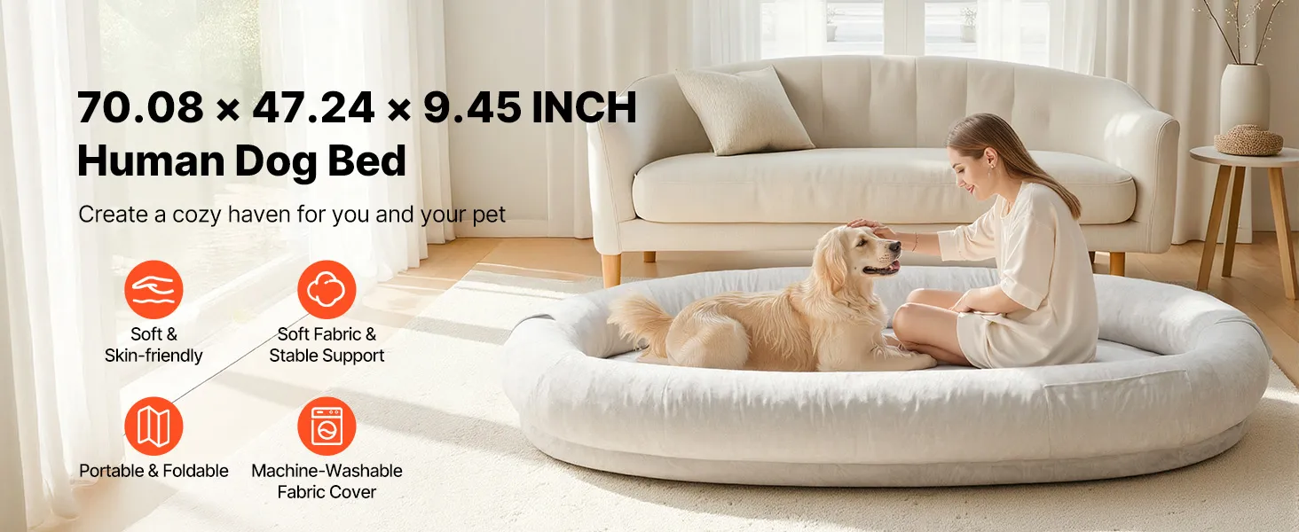 Gemütlicher gemeinsamer Raum: Mit den Maßen 1780 x 1200 x 240 mm (70,08 x 47,24 x 9,45 Zoll) bietet unser Haustierbett für Erwachsene eine ovale, geschlossene Form, die Sie und Ihren vierbeinigen Freund sanft umschließt. Ob Nickerchen oder gemeinsamer Filmabend – Sie genießen beide großzügigen Komfort und einen ruhigen Ort, der Ihre gemeinsamen Momente entspannt und vertraut gestaltet.