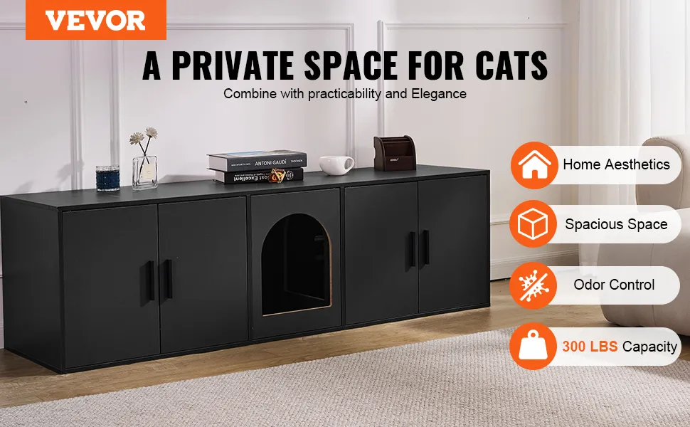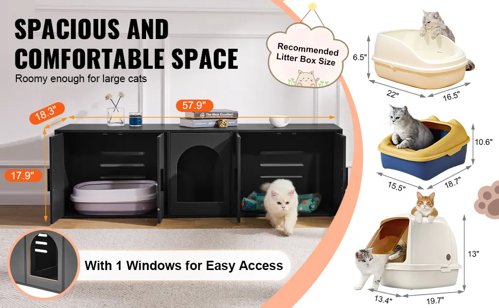 Der große Raum mit 3 Eingängen ermöglicht Ihrer Katze freien Zugang, während die meisten Hunde nicht hineingelangen können. So bleibt Ihre Katze sicher und ungestört. Egal welche Katzentoilettengröße Sie verwenden, dieses Katzentoilettenmöbel passt perfekt hinein und bietet viel Bewegungsfreiheit.