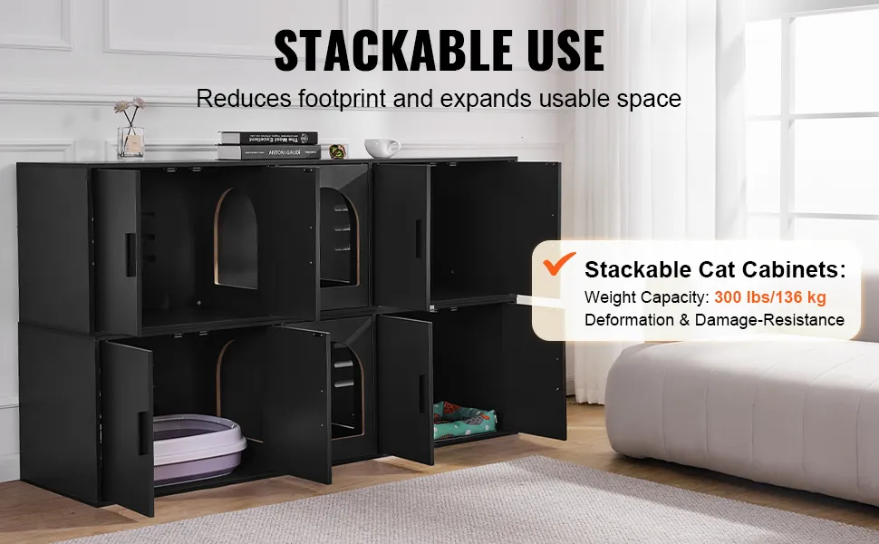 Mit einer Tragkraft von 136 kg ist der Katzentoilettenschrank stapelbar und nutzt den vertikalen Raum optimal aus. Die robuste Konstruktion gewährleistet dauerhafte Formbeständigkeit und sorgt für ein effizientes und ordentliches Wohnumfeld.