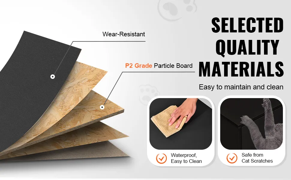 Hochwertige Materialien: Hergestellt aus Spanplatten der Güteklasse P2 mit glatter, wasserdichter und kratzfester Oberfläche. Unsere Katzentoilette für den Innenbereich ist sicher für Haustiere, leicht zu reinigen und für eine einfache Montage vorgebohrt.