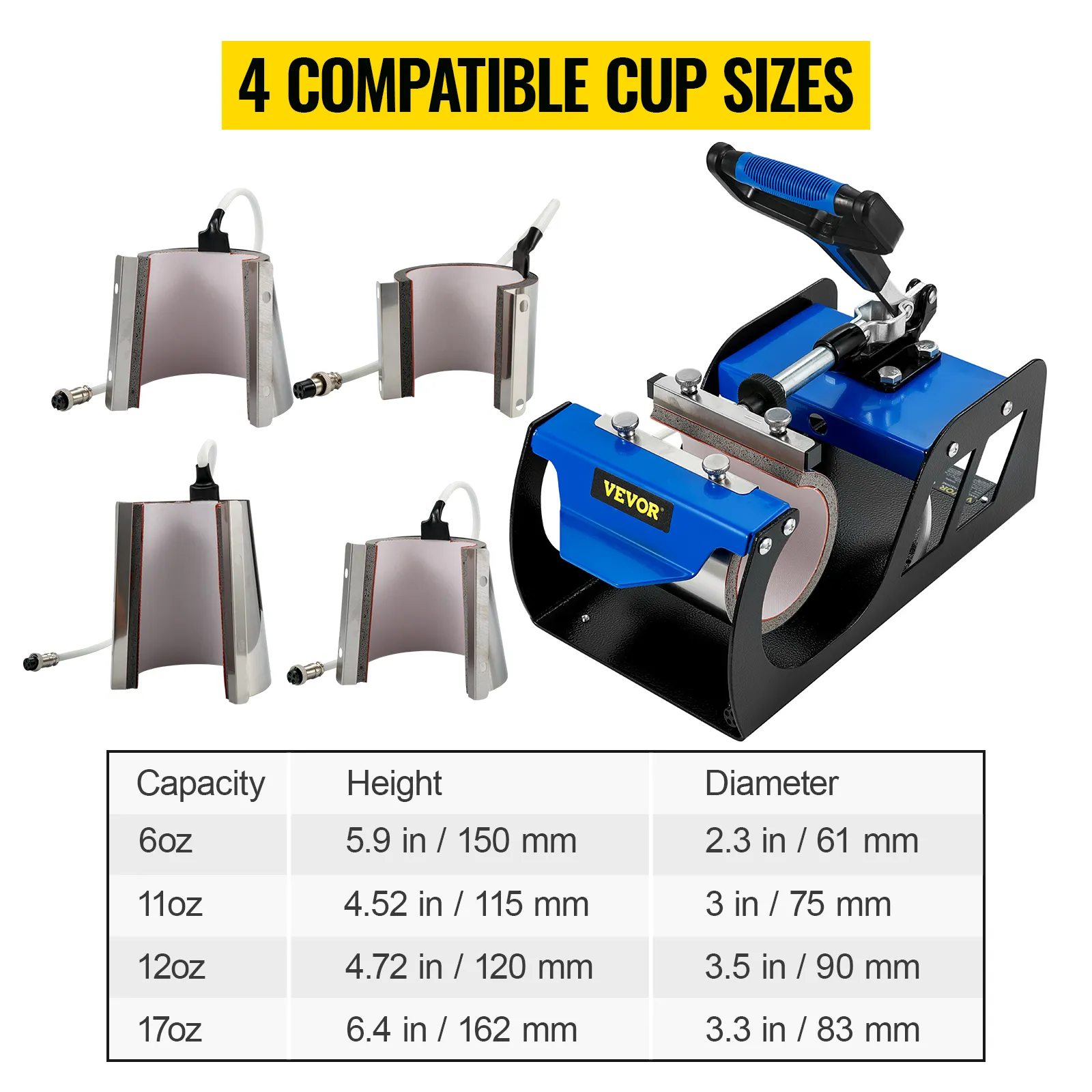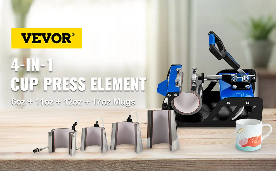 Suchen Sie eine Tassenpresse, die Tassen mit unterschiedlichem Fassungsvermögen transportieren und sublimieren kann? Keine Notwendigkeit, eine andere Maschine zu kaufen. Alles, was Sie tun müssen, ist den 4-in-1-Becherpressenaufsatz von VEVOR zu wählen. Sie werden feststellen, dass dies eine enorme Geldersparnis ist. Bitte genießen Sie den endlosen Spaß, unvergessliche individuelle Tassen für Ihren Liebhaber, Ihre Familie und Ihre Freunde herzustellen.