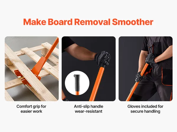 Der gepolsterte, rutschfeste Griff des Palettenbrechers reduziert die Ermüdung der Hand und verbessert die Kontrolle. Die mitgelieferten Handschuhe bieten zusätzlichen Schutz und sorgen für ein sanfteres Hebelgefühl.