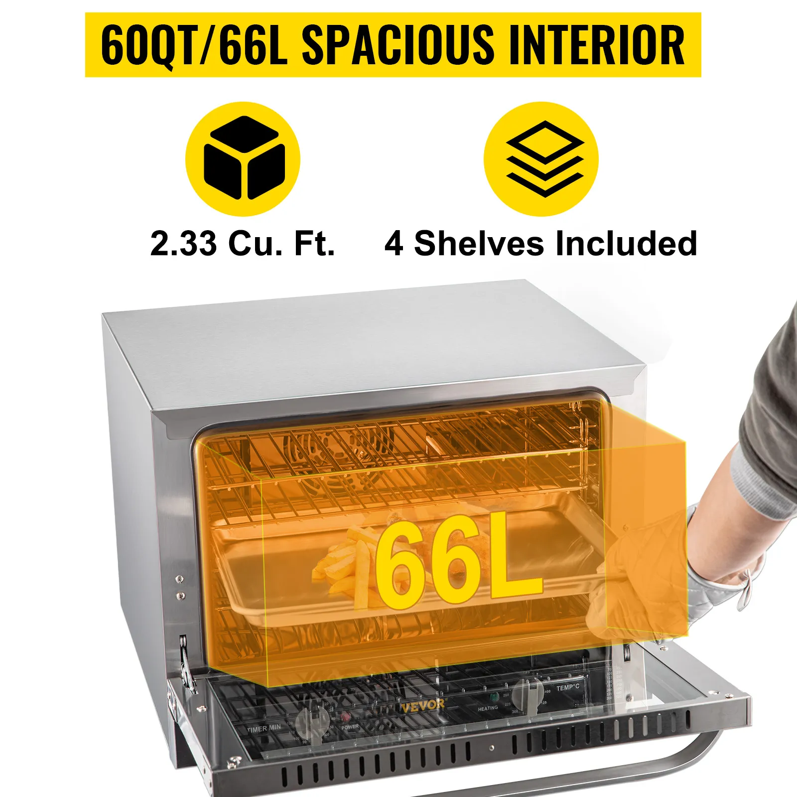Dieser Toaster in halber Größe verfügt über einen 2,33 Qt (66 L) Innenraum mit Abmessungen von 18,5 x 15,4 x 14,2 Zoll / 47 x 39 x 36 cm, perfekt für eine Vielzahl von Lebensmitteln in großen Mengen. Der 4-lagige Innenraum ist ausreichend, um mehrere Gerichte gleichzeitig zu backen.