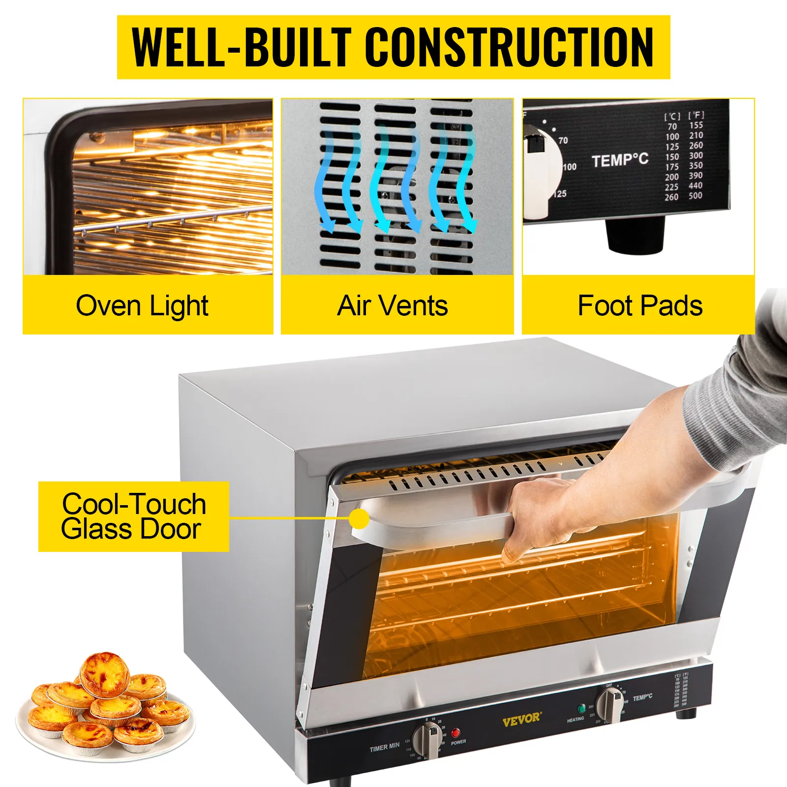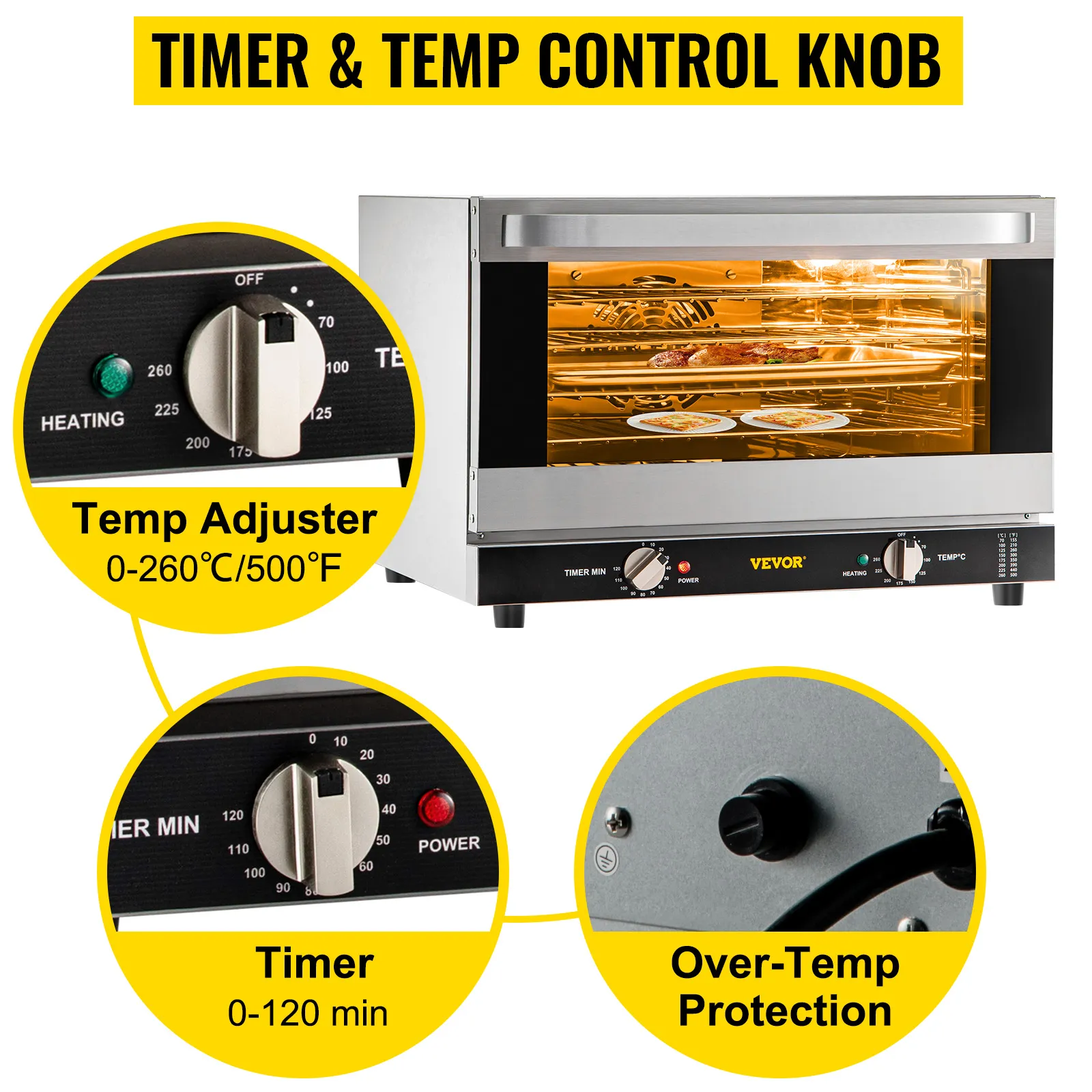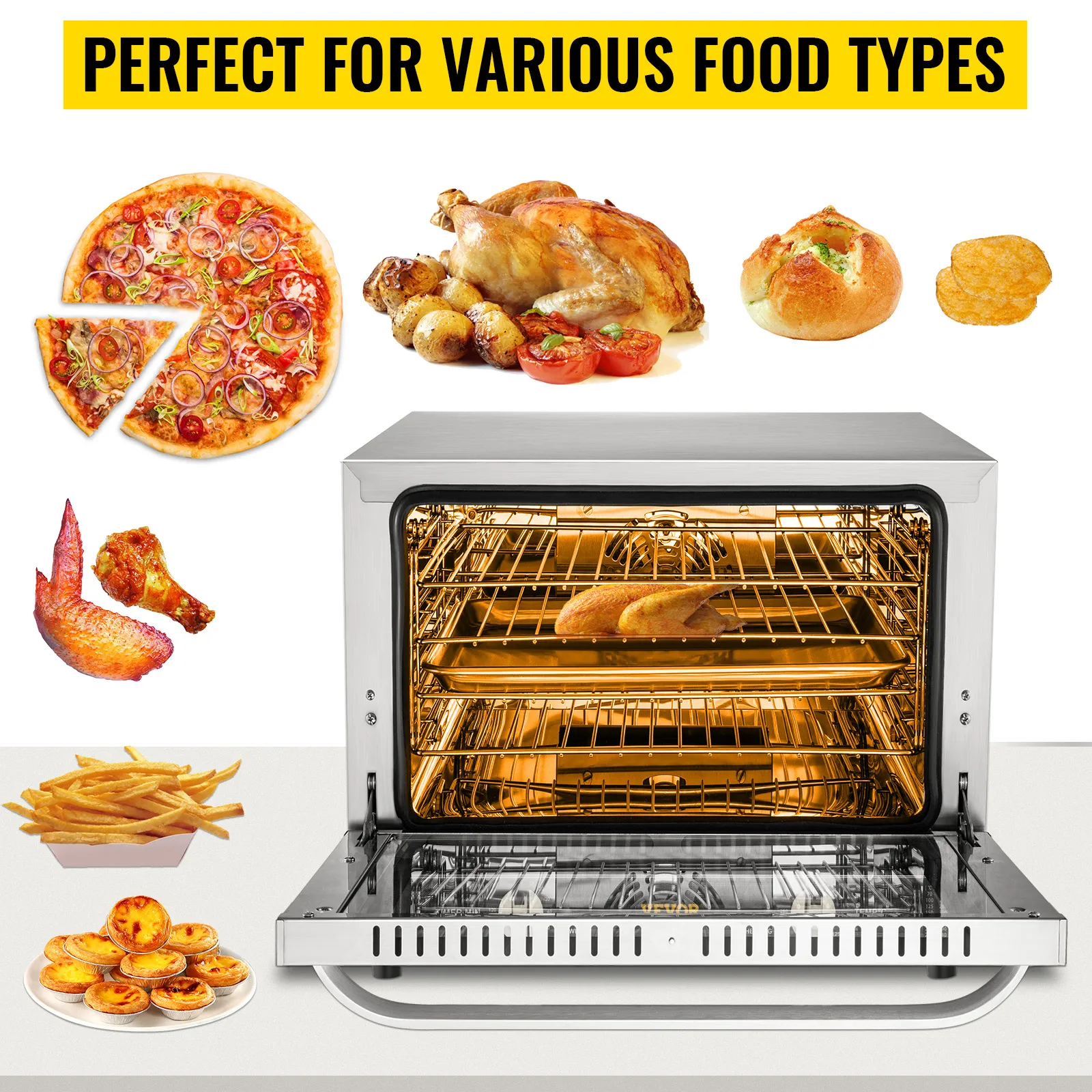 Unser tragbarer Heißluftofen, der schnell große Mengen leckerer Speisen backt, soll Ihr zuverlässiger Helfer werden, ohne zu viel Platz in Ihrer Küche einzunehmen. In seinem kompakten Gehäuse sind eine Reihe praktischer Funktionen enthalten, darunter der geräumige Antihaft-Innenraum, die gut gebaute Vordertür, der geräuschlose Lüfter und die kompletten Gitterroste und die Lebensmittelpfanne. Es eignet sich perfekt zum Backen von Pizza, Gebäck, Brot, Sandwiches, Hühnchen und anderen Snacks direkt auf Ihrer Arbeitsplatte und wird häufig in Cafés, Kiosken, Imbissbuden, Restaurants usw.