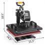 Digital multi-function heat press machine. This all-in-one press includes flat platen, mugs and plates. The swing-away heat press boasts all of the must-have attachments. It owns a built-in Teflon coated 12"x15" (30x38 cm) heat platen with a full range of heating coils to allow for consistency throughout its surface. Digital timer control is adjustable up to 999 seconds. Initial temperature setting range: 93-254℃. Highest temperature setting range: 200-450℉.