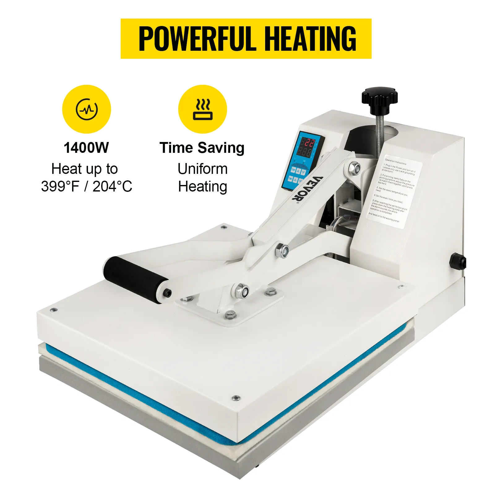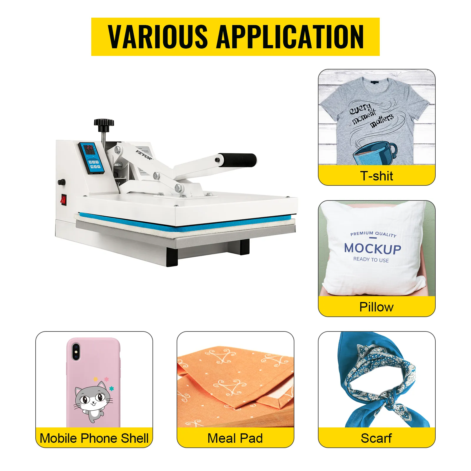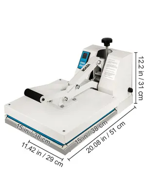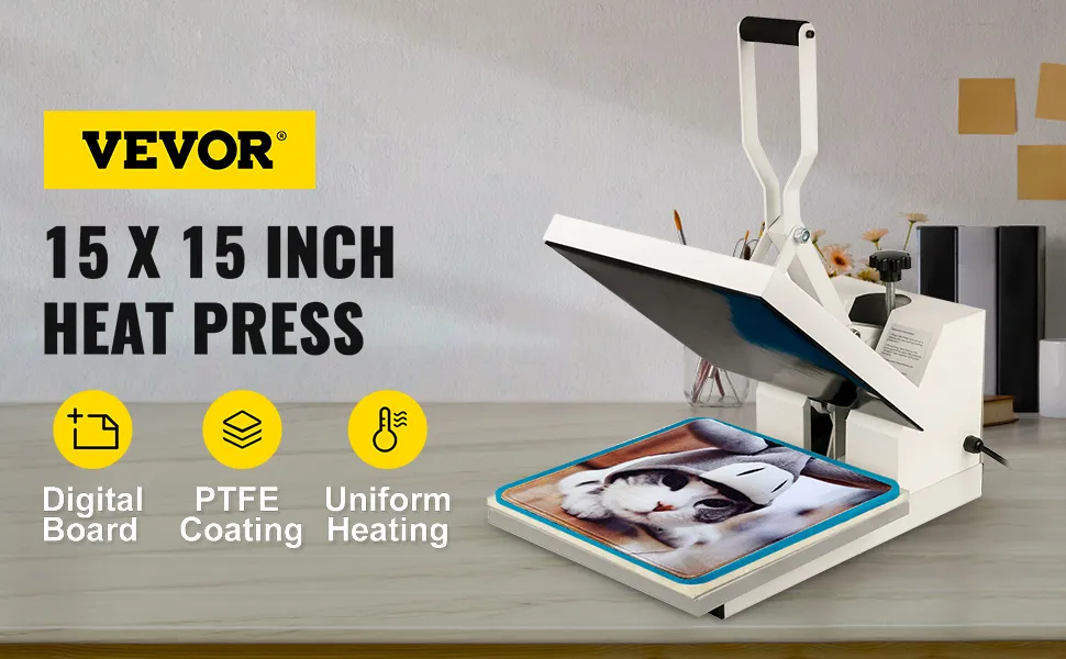 - Diese T-Shirt-Druckmaschine hat eine eingebaute teflonbeschichtete 38 x 38 cm (15 x 15 Zoll) Heizplatte mit einer ganzen Reihe von Heizspulen, um eine gleichmäßige Oberfläche zu gewährleisten. Sie eignet sich perfekt für die Übertragung von Buchstaben, Zahlen und Bildern auf T-Shirts, Kleidung, Taschen, Puzzles, Ausweishüllen, Fliesen usw.