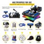 Diese Hemddruckmaschine verfügt über verschiedene Beschläge, darunter eine Walzenpresse, eine Hut- / Kappenpresse, drei Becherpressen, eine Aluminiumtopfpresse und zwei Plattenpressen, mit denen Muster auf T-Shirts, Kappen, Becher, Teller und Platten übertragen werden können andere Gegenstände mit flacher Oberfläche.