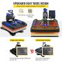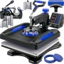 Diese Hemddruckmaschine verfügt über verschiedene Beschläge, darunter eine Walzenpresse, eine Hut- / Kappenpresse, drei Becherpressen, eine Aluminiumtopfpresse und zwei Plattenpressen, mit denen Muster auf T-Shirts, Kappen, Becher, Teller und T-Shirts übertragen werden können andere Gegenstände mit flacher Oberfläche.