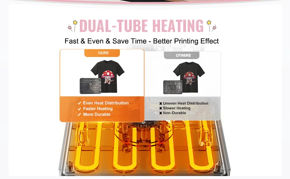 Doppelte Isolierung: Dank der doppelten Isolierung erreicht die Oberflächentemperatur der Hemdenpresse nur 50-70 °C, obwohl die Arbeitstemperatur 210 °C übersteigt. Im Vergleich dazu können herkömmliche Bügeleisen bis zu 70-100 °C erreichen. Dies reduziert das Risiko von Verbrennungen und gewährleistet eine stabile Temperatur während des Transferprozesses, sodass bei jedem Transfer ein perfektes Ergebnis erzielt wird.