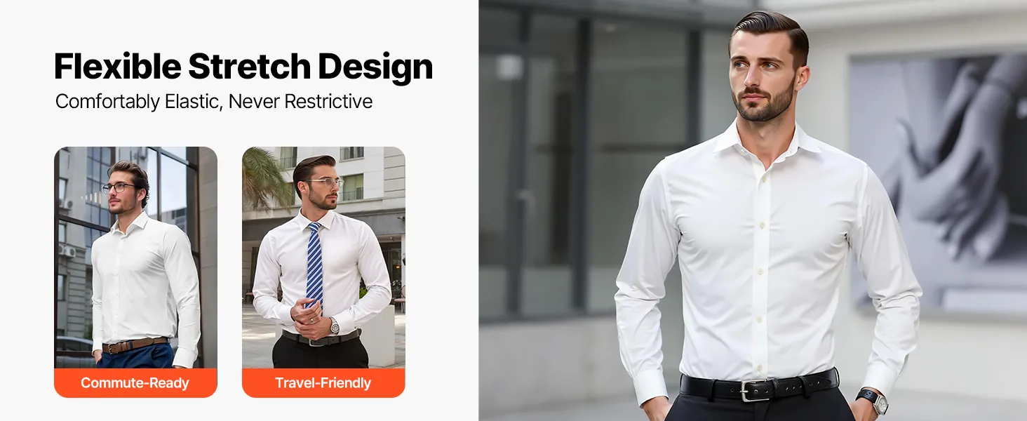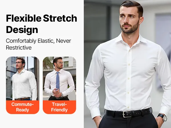 Dieses formelle Herrenhemd aus hochelastischem Elasthan-Mischgewebe passt sich Ihrer Körperform an. Es bleibt auch bei langem Sitzen oder aktiver Bewegung bequem – kein Einklemmen, kein Ziehen, nur zuverlässige Dehnbarkeit, die Ihnen ein angenehmes Tragegefühl gibt.