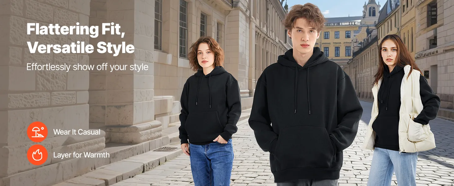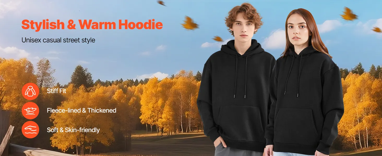 Weiche und kuschelige Mischung: Wir verwenden eine Mischung aus 56 % Polyester und 44 % Baumwolle, die außen glatt und innen weich ist. Das gebürstete Fleece des Hoodies hält Sie warm und bequem, ohne sich sperrig oder schwer anzufühlen.