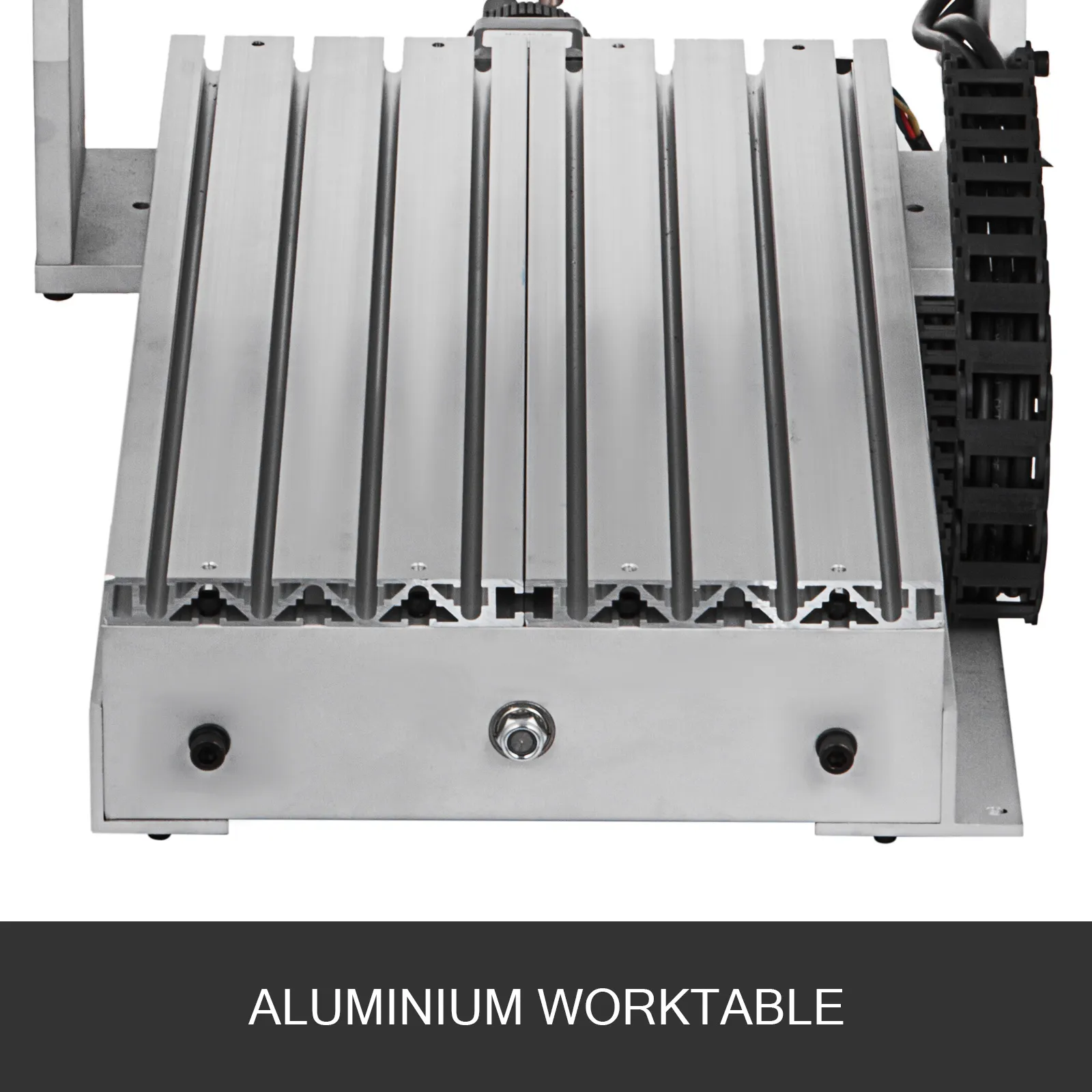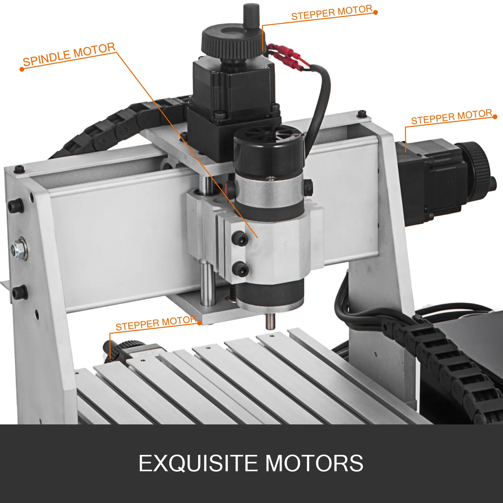 Auf drei Achsen gibt es jeweils ein zweiphasige 57-Schrittmotor(2A) für einfache Bewegung, die durch externe Kupplungen verbunden sind und eine hohe Drehmomentübertragung ermöglicht. Knöpfe mit kleinen Griffen an Schrittmotoren können die Positionierung anpassen. 300W-Spindelmotor auf Z-Achse kann Drehzahl von 8000 U/min (stufenlose Drehzahlregelung) erreichen.