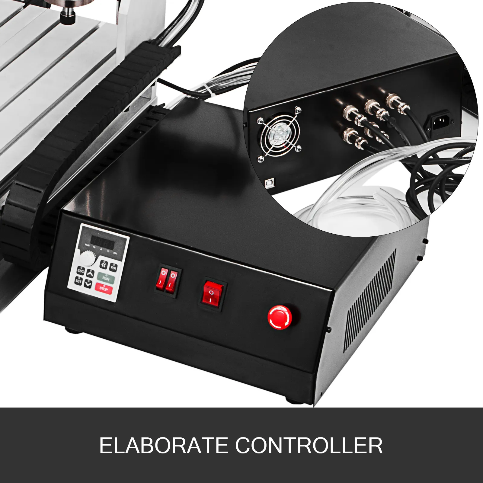 Die Graviermaschine verfügt über einen Controller mit integriertem Transformator, der eine stabile Stromversorgung für Steuereinheit bietet und langlebig verwenden kann. Design von 1-zu-1-Schnittstellendesign und Not-Aus-Taster für hohe Sicherheit.