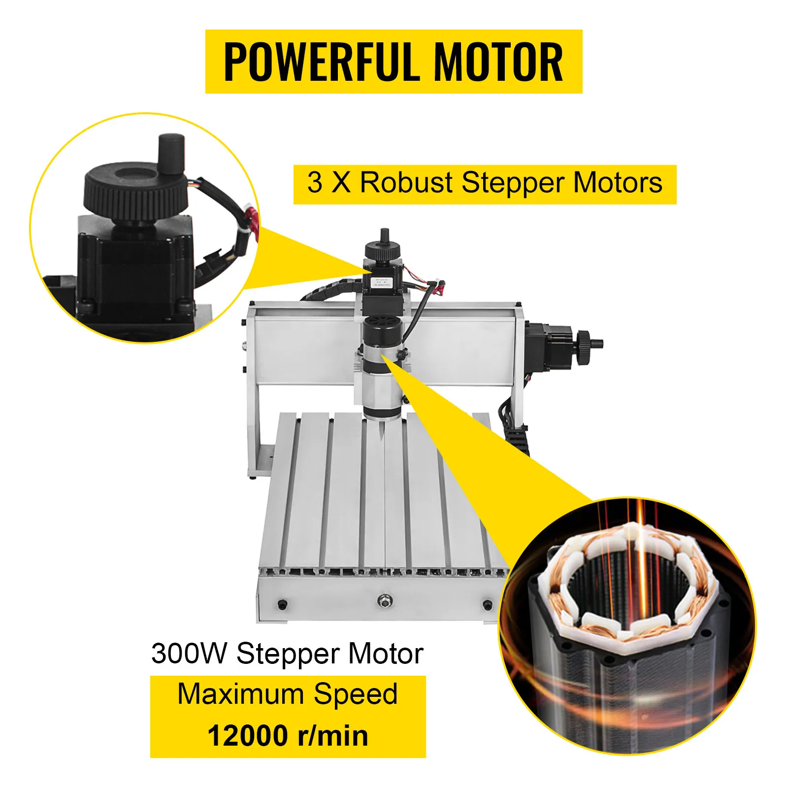 Auf drei Achsen gibt es jeweils ein zweiphasige 57-Schrittmotor(2A) für einfache Bewegung, die durch externe Kupplungen verbunden sind und eine hohe Drehmomentübertragung ermöglicht. Knöpfe mit kleinen Griffen an Schrittmotoren können die Positionierung anpassen. 300W-Spindelmotor auf Z-Achse kann Drehzahl von 8000U/min (stufenlose Drehzahlregelung) erreichen.