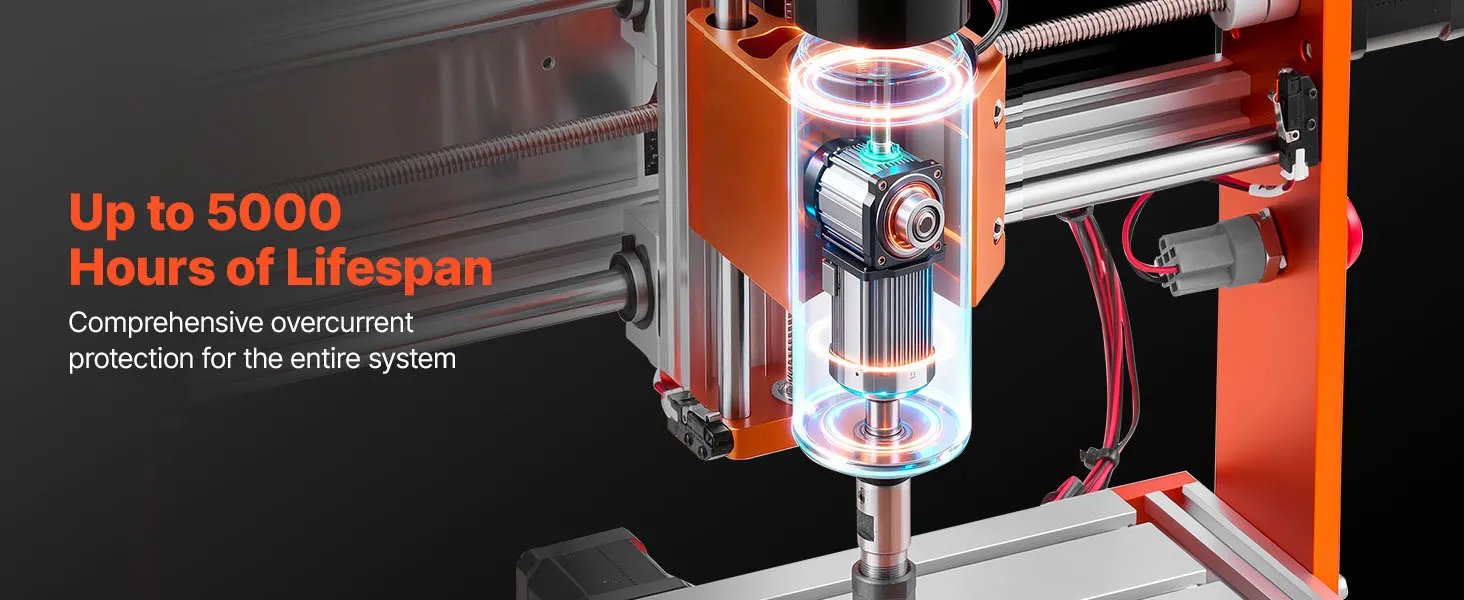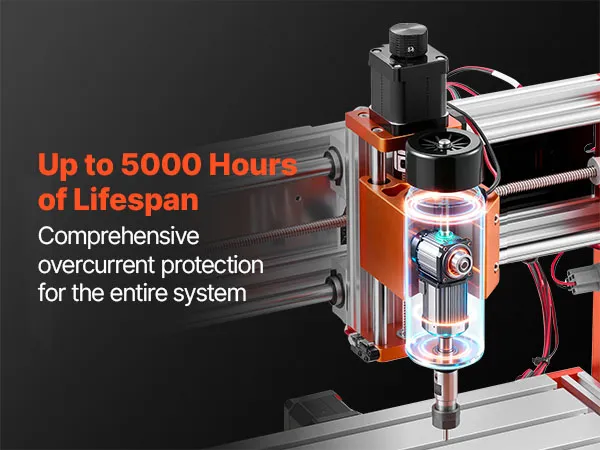 Sichere und robuste Konstruktion: Die Spindel verfügt über einen Stromüberwachungsschutz, der Störungen reduziert und die Lebensdauer auf bis zu 5000 Stunden verlängert. Die CNC-Fräsmaschine ist mit 6 Endschaltern, einem Not-Aus-Schalter und Handrädern an den XYZ-Achsen für präzise Bedienung ausgestattet
