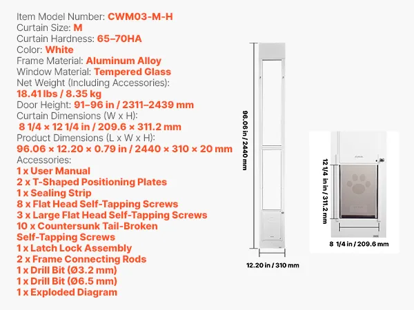 Höhenverstellbar: Die Hundeklappe für Glasschiebetüren ist von 91 bis 96 Zoll (2311-2439 mm) höhenverstellbar und passt in verschiedene Türrahmengrößen. Diese Funktion vereinfacht die Installation und macht sie sowohl für Anfänger als auch für erfahrene Benutzer einfach.