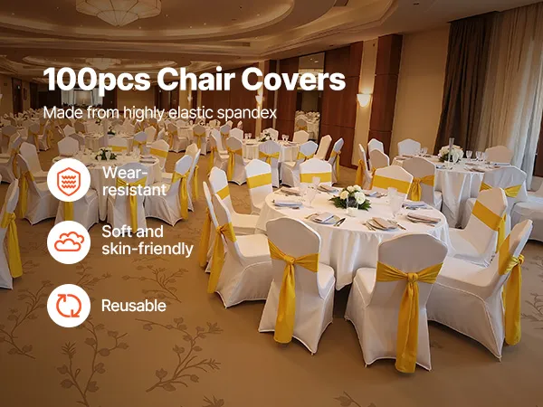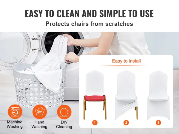 Die weißen Stuhlhussen von VEVOR sind leicht zu reinigen. Sie können von Hand oder in der Maschine gewaschen oder mit einem milden Reinigungsmittel chemisch gereinigt werden – Bügeln ist nicht erforderlich. Diese zeitsparende Funktion stellt sicher, dass Ihre Hussen immer für die nächste Veranstaltung bereit sind.