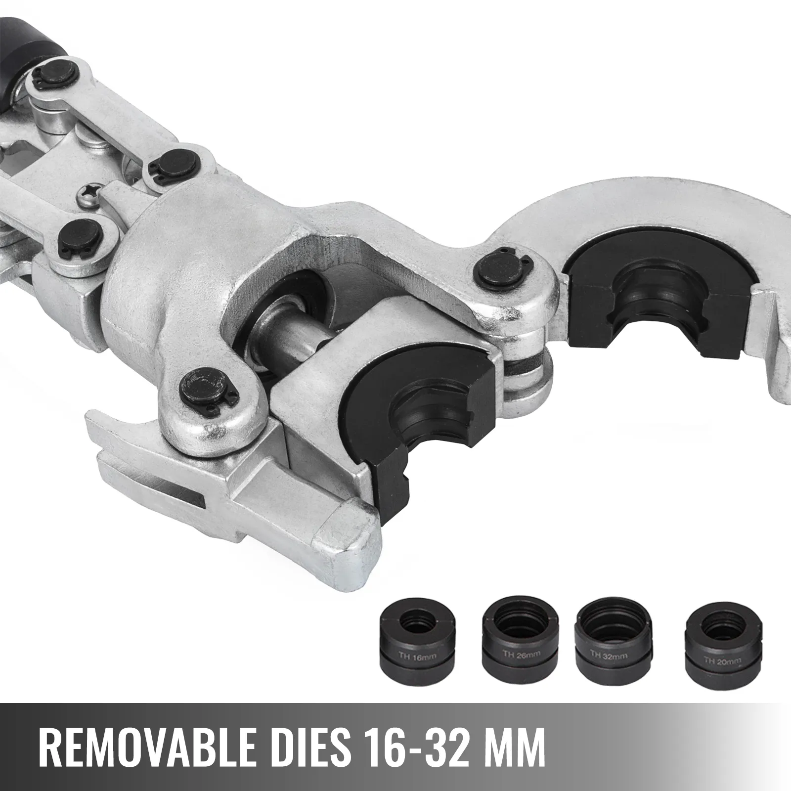 Die Rohrpresszange wird mit vier austauschbaren Backen unterschiedlicher Größe (16 mm, 20 mm, 25 mm, 32 mm) geliefert, die für die meisten Rohrpressarbeiten geeignet sind. Der Kopf ist leicht zu öffnen, sodass die Backen mühelos gewechselt werden können.