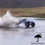 Blaues Geländefahrzeug fährt durch Wasser mit Wasserdichtigkeitssymbol; hydraulische Seilwinde von VEVOR.