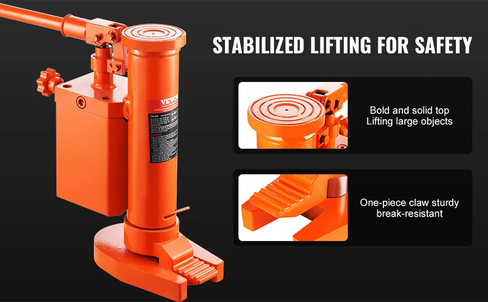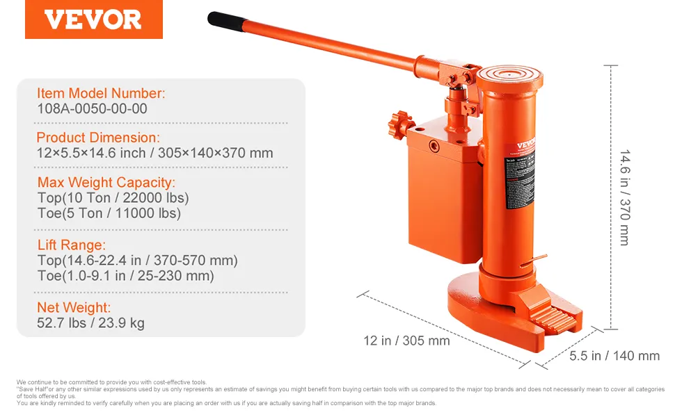 Der 10-Tonnen-Wagenheber von VEVOR bietet vielseitige Höheneinstellungen. Der obere Höhenbereich beträgt 14,6 bis 22,4 Zoll. Der Zehenhöhenbereich beträgt 1,0 bis 9,1 Zoll, wodurch er für verschiedene Höhenanforderungen geeignet ist. Er hebt problemlos Fahrzeuge und Geräte mit geringer Bodenfreiheit an. Dieses Werkzeug ist ideal für die Fahrzeugwartung, den Bau und die Handhabung von Ausrüstung. Mit der einstellbaren Höhe können Sie problemlos verschiedene Objekte anheben. Diese Flexibilität ist für verschiedene Hebeaufgaben unerlässlich. Die Höheneinstellungsfunktion dieses Wagenhebers ist besonders in engen Räumen nützlich. Er erfüllt die Anforderungen sowohl professioneller als auch privater Benutzer.