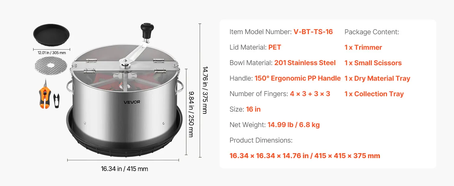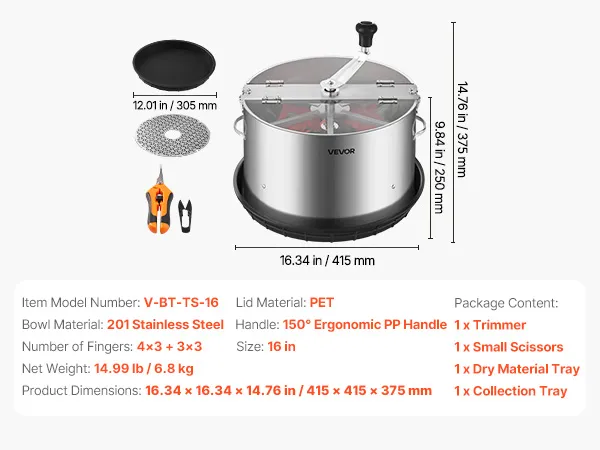 Effizientes Blattschneiden: Diese 16 Zoll (40,6 cm) große manuelle Erntemaschine verfügt über einen leistungsstarken Motor mit variabler Geschwindigkeit und mehrere Klingentypen, die ein effizientes Schneiden verschiedener Pflanzenarten ermöglichen und gleichzeitig die Beschädigung der Knospen minimieren. Der transparente PET-Deckel bietet volle Sicht für präzise Schnittergebnisse.