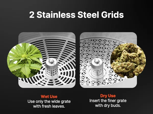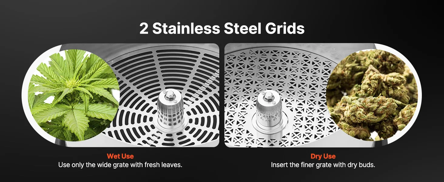 Unser Blattschüssel-Trimmer verfügt über zwei Edelstahlroste: Verwenden Sie den dichten Rost für trockenes Trimmen oder den breiten Schlitzrost für klebrige, nasse Blätter. Wechseln Sie einfach zwischen den Modi, um alle Ihre Gartenbedürfnisse zu erfüllen.
