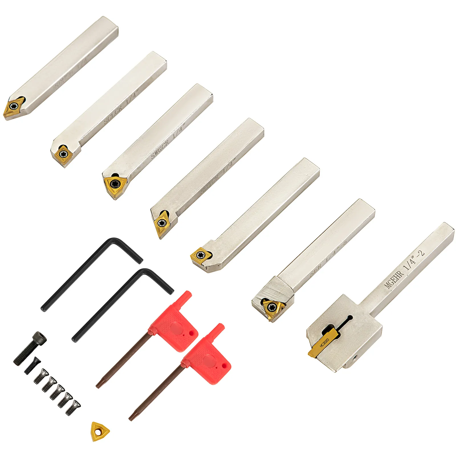 【ZUSÄTZLICHE ZUBEHÖRTEILE】 - Dieses Drehwerkzeugset wird mit Installationszubehör geliefert : 2 Schraubenschlüssel (4 mm) und 2 Ringschlüssel (T15), ein Satz Montageschrauben und ein Messer (90°T31305A) bieten viel Komfort beim Verlängern Lebensdauer dieser Metalldrehmeißel.