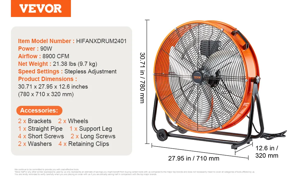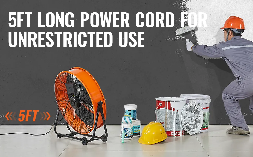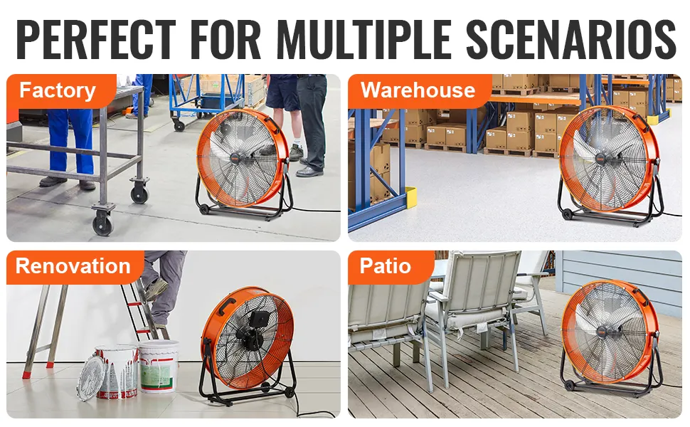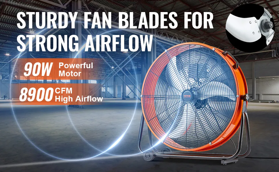 Starker Luftstrom: Der hochwertige Motor liefert konstant einen starken Luftstrom mit einer maximalen Leistung von 8900 CFM und sorgt so für eine effektive Belüftung jeder Umgebung. Dieser industrielle Bodenventilator bewältigt Staubentfernung, Kühlung und Luftaustausch problemlos.