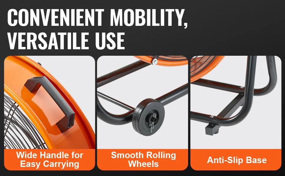 Einfache Mobilität: Dieser Ventilator ist mit einem breiten Griff für den einhändigen Transport ausgestattet und lässt sich leicht bewegen. Leichtgängige Rollen erleichtern das Manövrieren über glatte Oberflächen oder unebenes Gelände und sorgen dafür, dass Sie Ihre Belüftungsbedürfnisse immer in Reichweite haben.