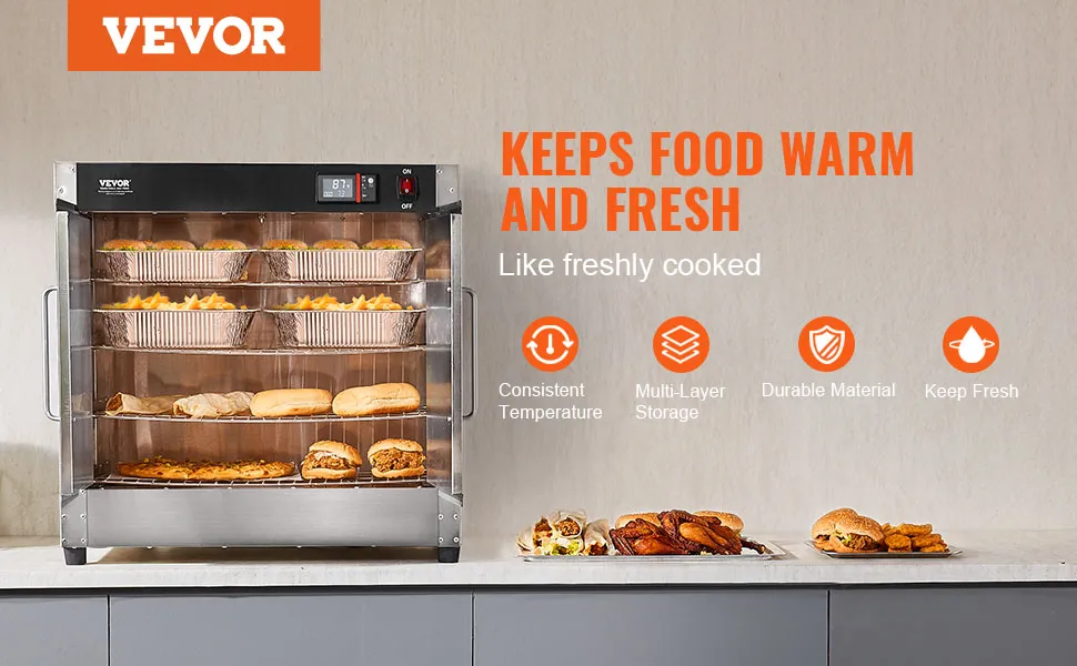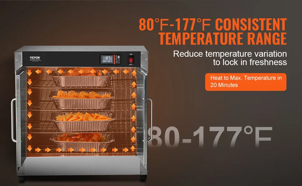Lange warmhalten: Der kommerzielle Warmhalteschrank für Speisen verfügt über einen einstellbaren Temperaturbereich von 80℉ bis 177 ℉(26 bis 80 ℃) mit schneller Erwärmung und lang anhaltender Wärme. Dank der Echtzeit-Temperaturüberwachung und der einfachen Bedienung eignet er sich perfekt für die Aufbewahrung von köstlichem, saftigem gekochtem Fleisch, Nudeln, knusprig frittierten Speisen, fermentiertem Joghurt sowie getrocknetem Obst und Gemüse.