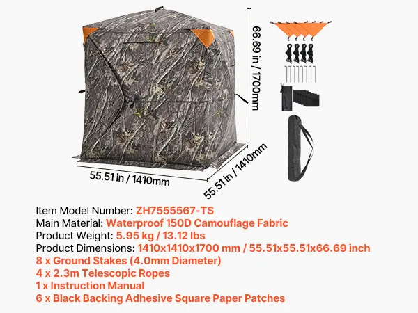 Es ist vielseitig und langlebig. Der starke Rahmen hält verschiedenen Bedingungen gut stand. Sie können es mehrmals auf- und abbauen, ohne die Struktur zu beschädigen. Selbst nach längerem Gebrauch ist kein Verschleiß sichtbar. Dies macht es zu einer zuverlässigen Wahl für verschiedene Jagdszenarien. Egal, ob Sie auf dem Grund eines Baches jagen oder es schon seit Jahren verwenden, diese Tarnung funktioniert gut. Ihr dunkles Tarnmuster fügt sich nahtlos ein und macht es weniger auffällig. Die VEVOR-Jagdtarnung ist ein effizientes, notwendiges und zuverlässiges Werkzeug für jeden Jäger.