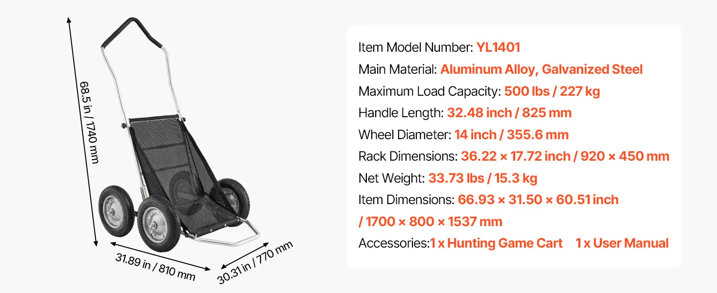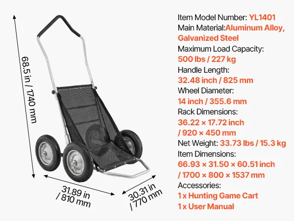 Hohe Tragfähigkeit: Dieser Wildwagen verfügt über einen 0.98 Zoll (24,8 mm) starken Aluminiumrahmen und trägt bis zu 500 lbs (227 kg). Robust und zuverlässig, verschleißfest und korrosionsbeständig, eignet er sich für den Transport schwerer Jagdausrüstung, Wild oder anderer Lasten