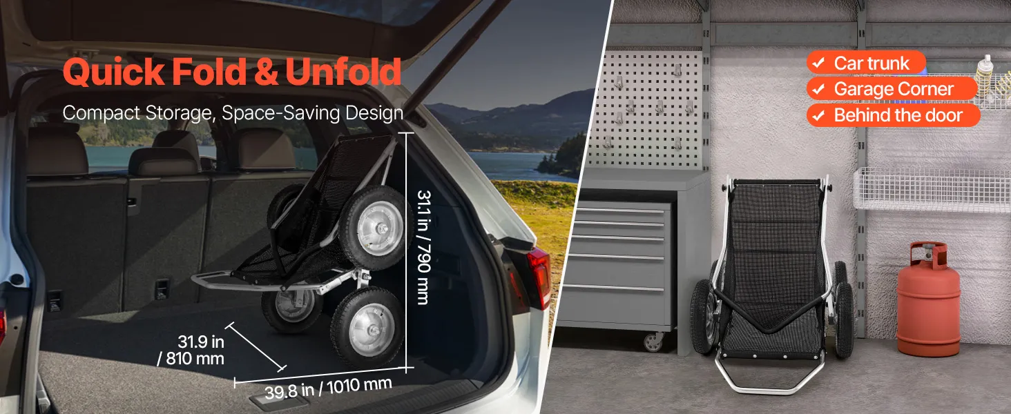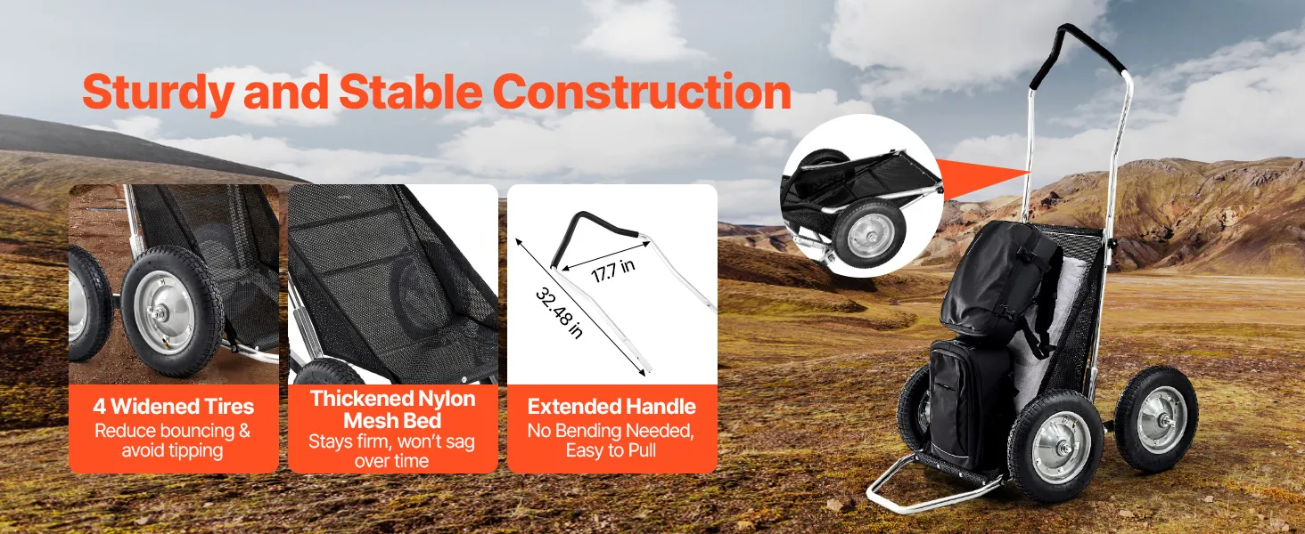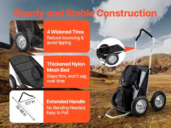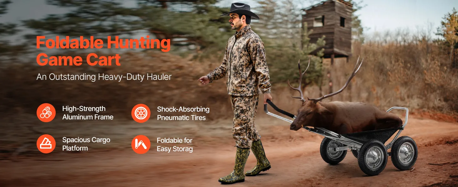Dieser Wildtransporter verfügt über vier verbreiterte, stoßdämpfende Reifen für eine sanfte Fahrt in unebenem Gelände, während die verstärkte Nylonnetz-Ladefläche ein Durchhängen verhindert. Das ergonomische Griffdesign reduziert das Bücken und sorgt für komfortable Jagdausflüge.