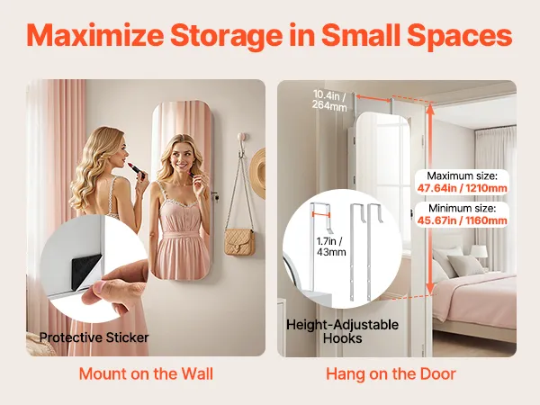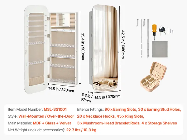 Flexible Montage & Sicherheit: Hängen Sie den Spiegel an einen Türrahmen oder befestigen Sie ihn mit den mitgelieferten Beschlägen an einer stabilen Wand. Dieser Spiegel mit Schmuckaufbewahrung wird mit zwei Schlüsseln geliefert, um Wertsachen sicher aufzubewahren und gleichzeitig Platz zu sparen. Einfache Montage dank klarer Anleitung