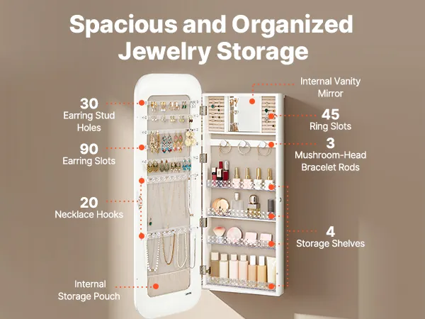Geräumige Fächer: Der Spiegelschmuckschrank bietet Platz für 90 Ohrringe, 30 Ohrstecker, 20 Halsketten, 45 Ringe, 3 Pilzarmbandhalter, 4 Regale für Kosmetika sowie Innentaschen für Masken oder Wattepads – so bleibt Ihr Schmuck geordnet und leicht zu finden