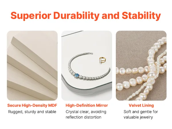 Hochwertige Materialien: Dieser Schmuckspiegel aus 44,9 lbs/ Fuß³-Kunststoffplatte ist langlebig, kratz- und verschleißfest und behält seine lang anhaltende Stabilität. Das weiche Plüschfutter schützt den Schmuck, und der hochwertige Glasspiegel lässt sich abwischen und glänzt wie neu
