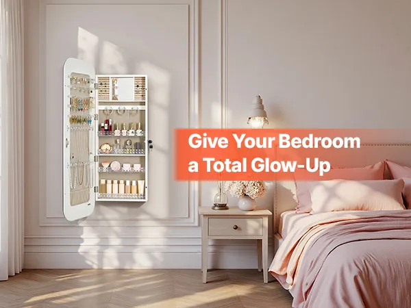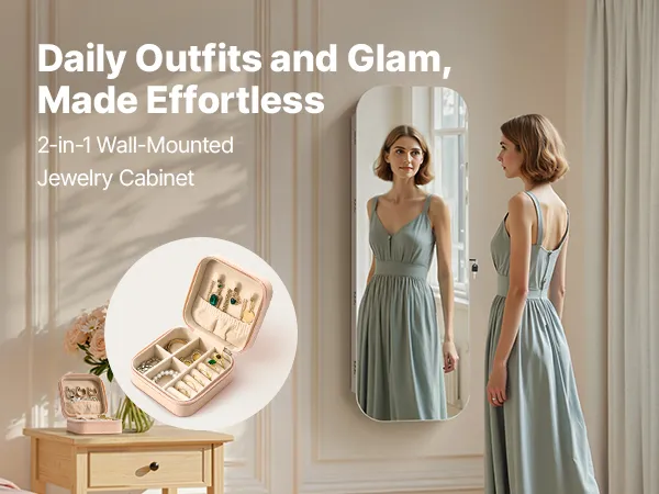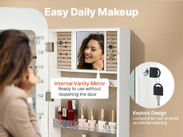 Ganzkörperspiegel & versteckter Stauraum: Nicht nur ein Schmuckschrank – der Spiegel mit Stauraum ist auch ein Ganzkörperspiegel mit klarer, verzerrungsfreier Reflexion. Greifen Sie schnell auf Make-up und Accessoires zu, überprüfen Sie Ihr Outfit und machen Sie sich selbstbewusst fertig