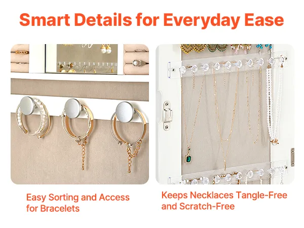 Der Schmuckspiegel verfügt über Halskettenhaken, damit Ihre Halsketten ordentlich präsentiert werden und sich nicht verheddern.