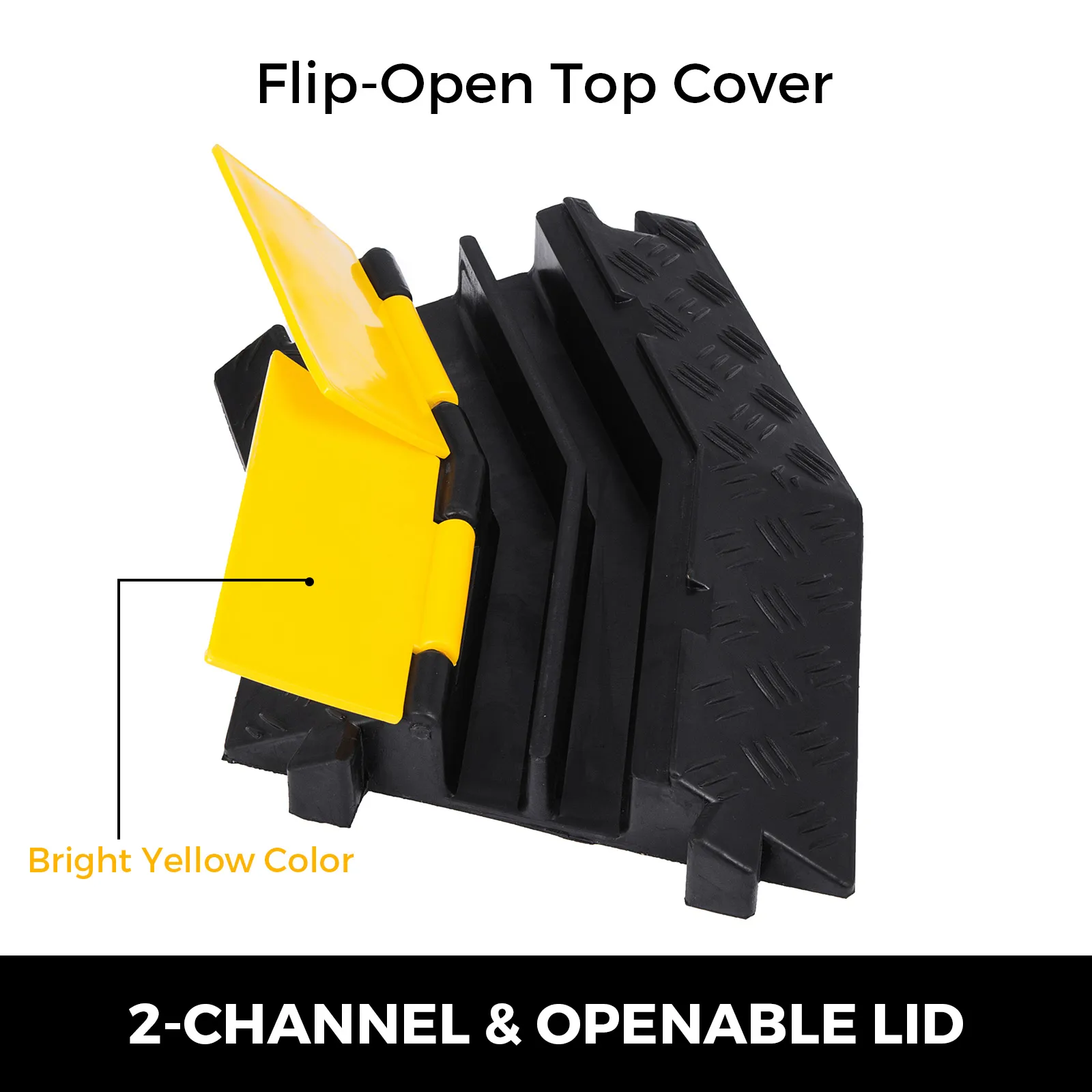 Es sind 2 Kanäle zur Verfügung, um 2 Leitungen von Verlängerungskabeln, Stromleitungen, Schläuchen und Netzwerkkabeln usw. zu schützen. Halten Sie die Drähte gut organisiert. Gelber PVC-Klappdeckel, robust und gut sichtbar, bietet zusätzliche Sicherheit.