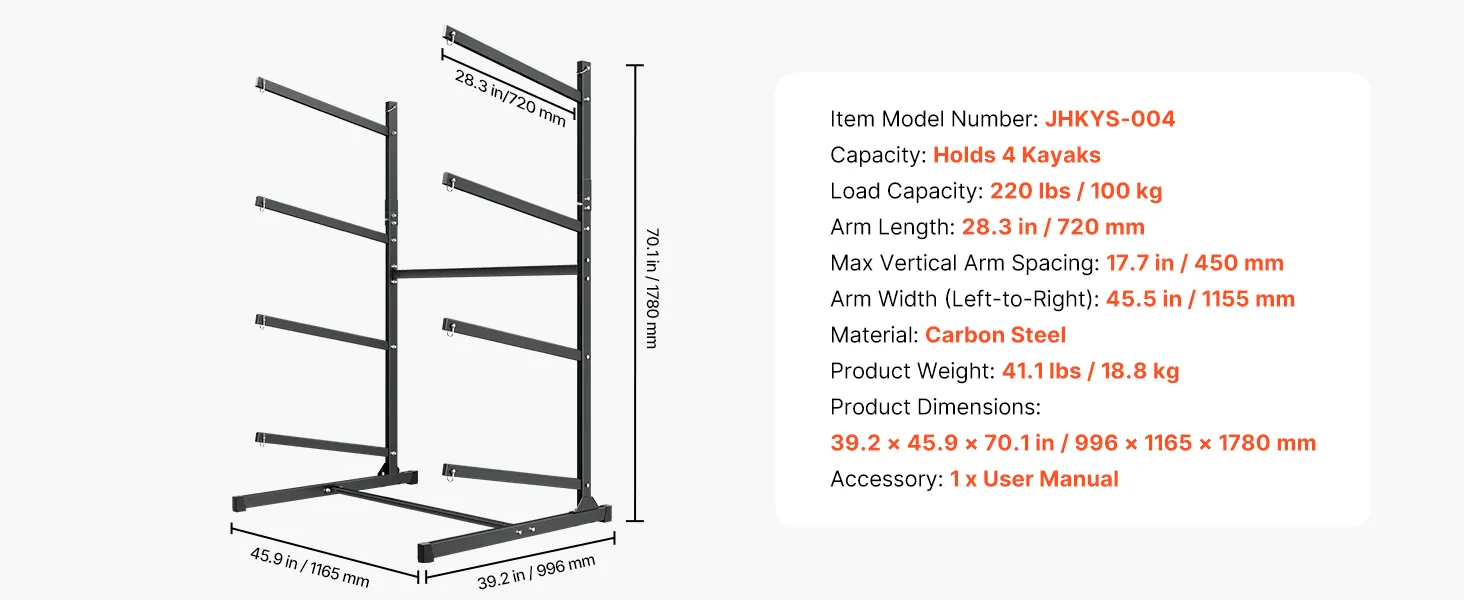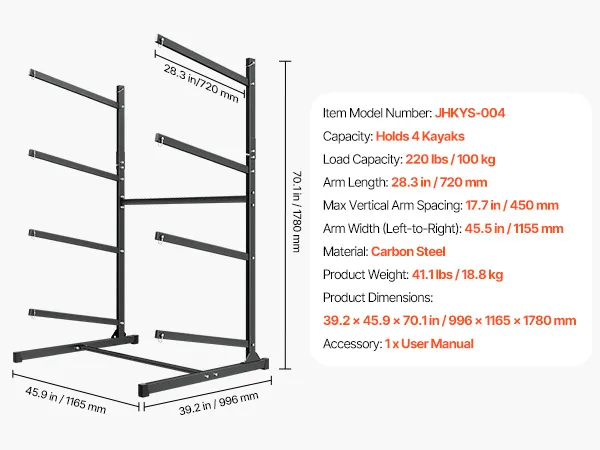 Hohe Kompatibilität: Dank 28,3 Zoll (72 cm) langer Arme und 45,5 Zoll (1155 mm) horizontalem Abstand passt unser Kajakständer für verschiedene Kajakformen und -größen. Der großzügige Abstand verhindert Einklemmen oder Beschädigungen des Rumpfes bei der Lagerung