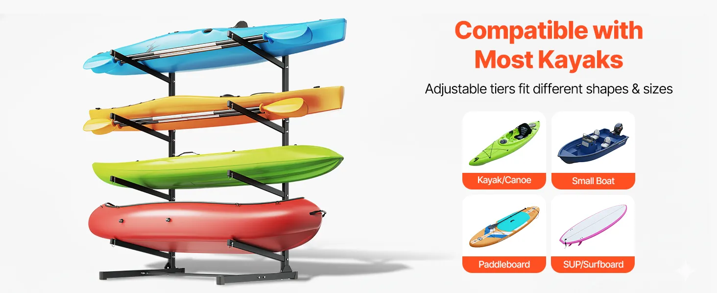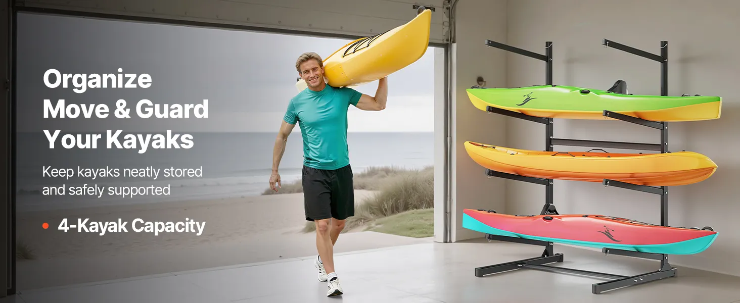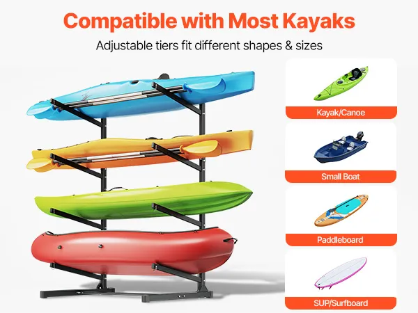 VEVOR Freistehendes Kajak-Aufbewahrungsregal für 4 Kajaks/Kanus/Surfbretter/Paddleboards, Kajakständer für Außen- und Innenbereich, Einstellbarer Kajakhalter, 90 kg Belastbarer Aufbewahrungsständer