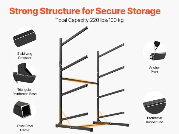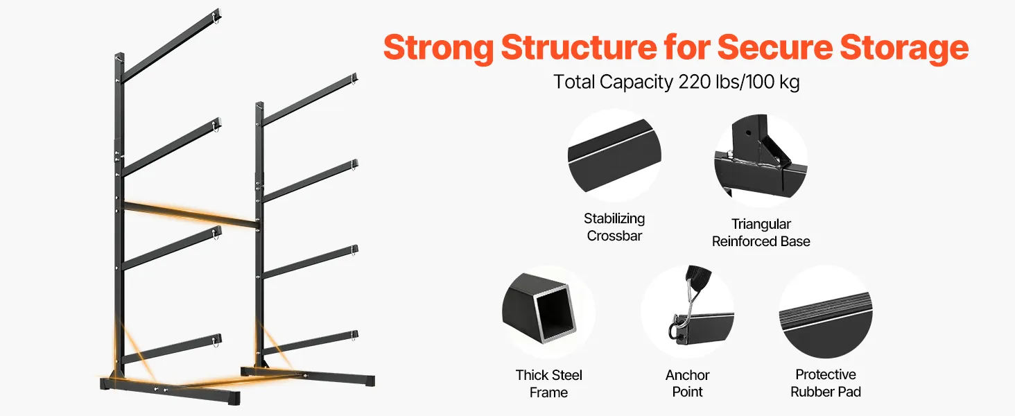 Sicherheit ist in jedes Detail integriert. Unser Kajakständer besteht aus hochwertigem Stahl und verfügt über eine verstärkte Basis, um ein Umkippen zu verhindern. Die Querstange erhöht die Stabilität, während der dicke Rahmen die Tragfähigkeit optimiert. Eine leichte Neigung nach oben verringert die Rutschgefahr.