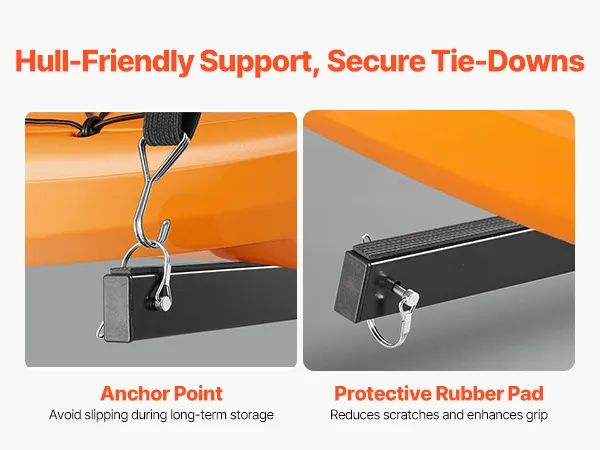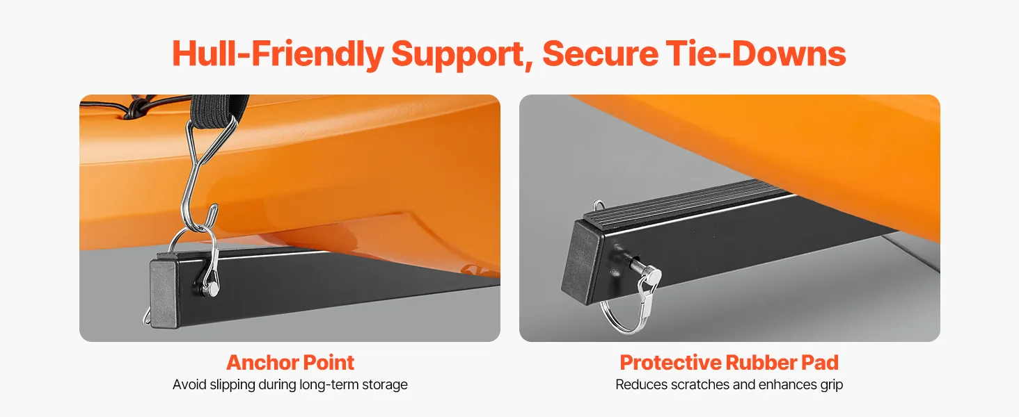 Kratz- und Rutschschutz: Jeder Arm des Kanu-Lagergestells ist mit einer Gummipolsterung versehen, die Kratzer und Dellen reduziert. Der integrierte Verankerungspunkt ermöglicht sicheres Verzurren und verhindert so, dass Ihre Kajaks während der Lagerung verrutschen oder herunterfallen