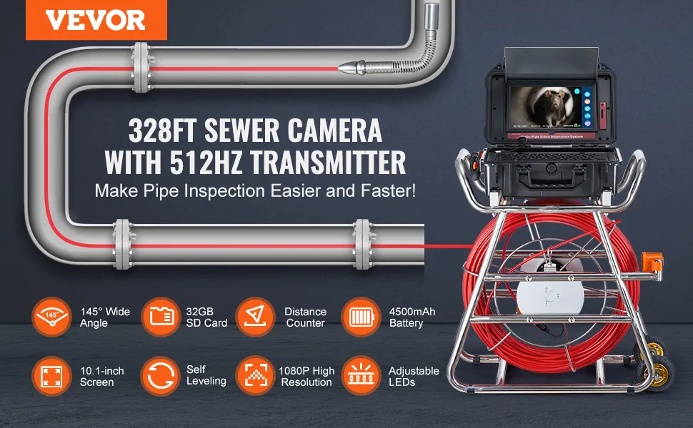 VEVOR Kanalkamera, 100 m, selbstnivellierende Rohrinspektionskamera mit 10,1-Zoll-Touchscreen, 512-Hz-Sender und Entfernungszähler, IP67-Rohrkamera mit 12 LEDs und 32-GB-Karte, Endoskop für Kanalrohre