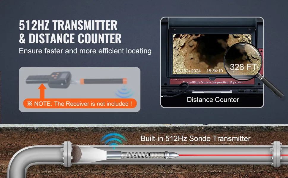 Verabschieden Sie sich vom Rätselraten und begrüßen Sie die präzise, effiziente Ortung! Unser integrierter 512-Hz-Sondensender und Entfernungszähler machen es einfacher denn je, Blockaden punktgenau zu identifizieren, Ihre Inspektionen zu rationalisieren und wertvolle Zeit zu sparen.